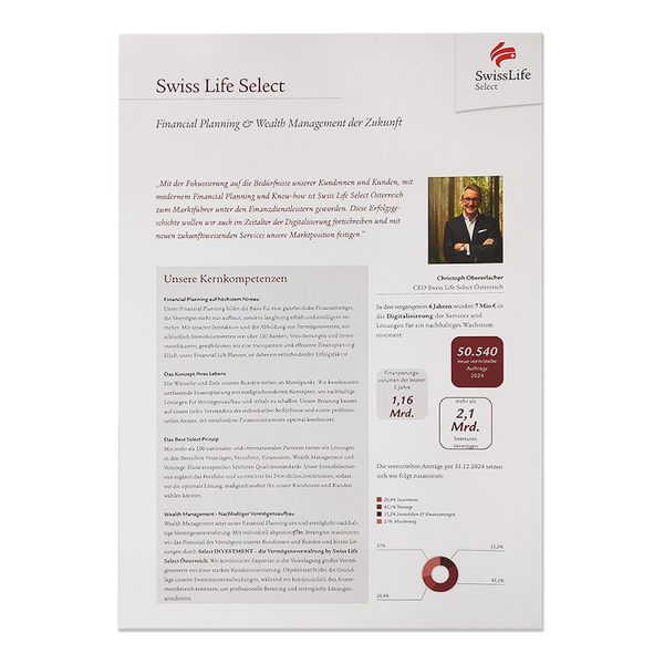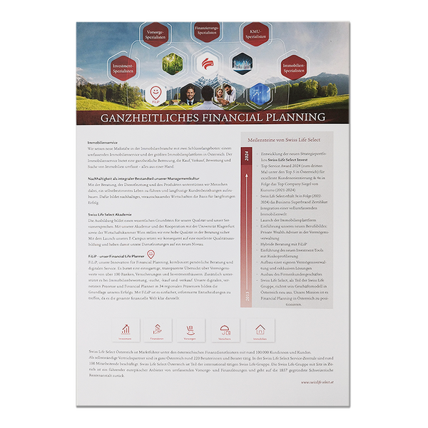 A00859Infos zu den Kernkompetenzen, Meilensteinen und Erfolgsgeschichten von Swiss Life Select verpackt auf einen schönen A4 Flyer.