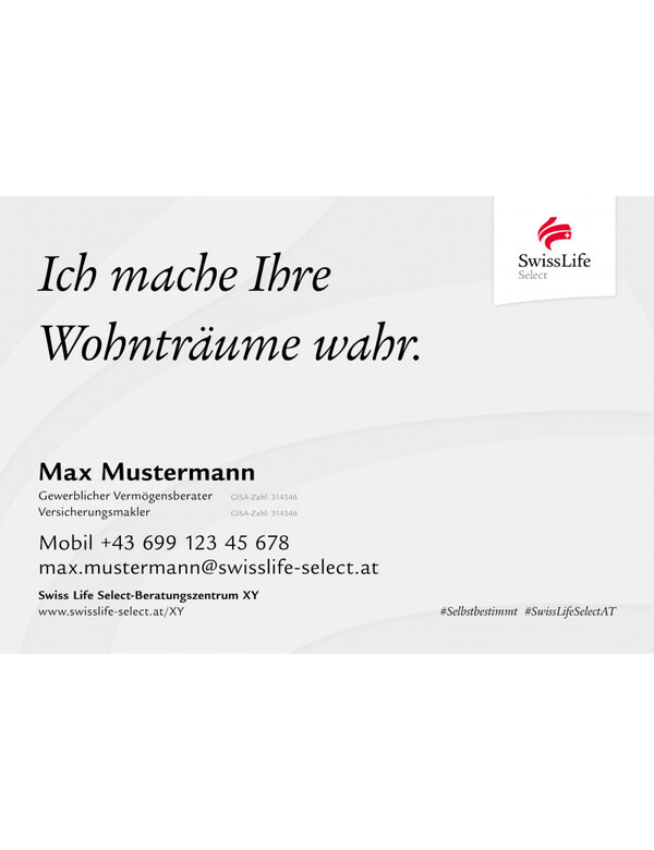 Dieser Artikel wird grundsätzlich nach den internen Richtlinien aber immer persönlich und individuell für Sie gestaltet. Die relevanten Daten darüber erhalten wir aus dem Swiss Life Select System. Nach dem Bestelleingang und vor dem Druck erhalten Sie einen Bürstenabzug zur Kontrolle und Freigabe.
