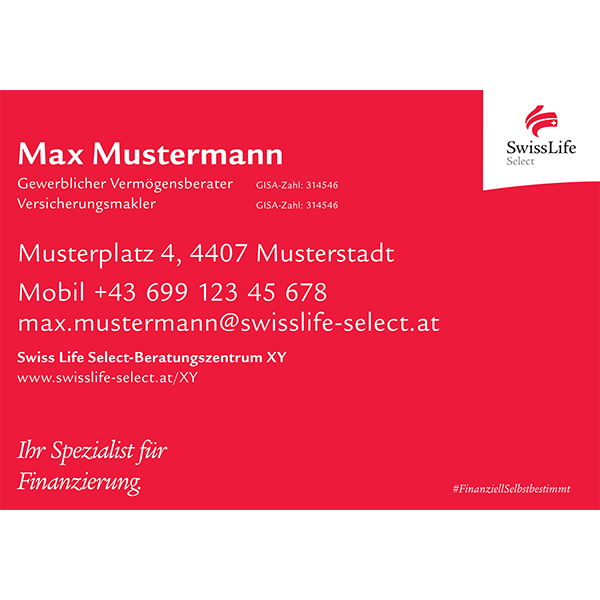 Dieser Artikel wird grundsätzlich nach den internen Richtlinien aber immer persönlich und individuell für Sie gestaltet. Die relevanten Daten darüber erhalten wir aus dem Swiss Life Select System. Nach dem Bestelleingang und vor dem Druck erhalten Sie einen Bürstenabzug zur Kontrolle und Freigabe.